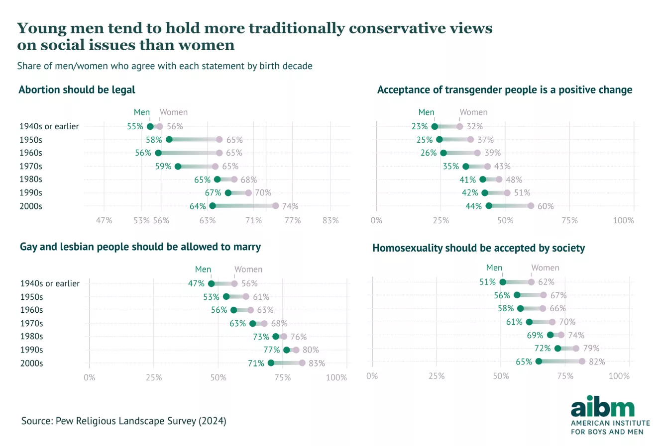 What the data does show, however, is that young men tend to hold more traditionally conservative views on social issues than women their age. In the Pew Religious Landscape Study, respondents were asked to evaluate statements such as “acceptance of transgender people is a positive change” and “homosexuality should be accepted by society.” Across these items, a consistent gender gap emerges: men, regardless of birth cohort, are less socially progressive than women from the same generation.