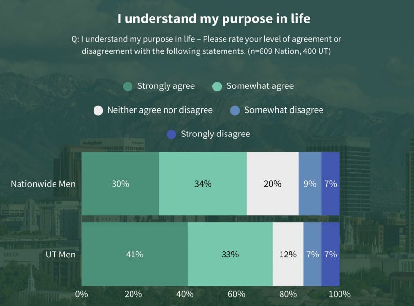 The good news is that most men say they understand their purpose in life. The share is a full 10 percentage points higher in Utah than the U.S. as a whole, almost certainly a reflection of the unusually high rates of religiosity and marriage in the state. But the share of men saying that they don’t know their purpose is not trivial: 16% nationally and 14% in Utah. Those are worrying statistics.