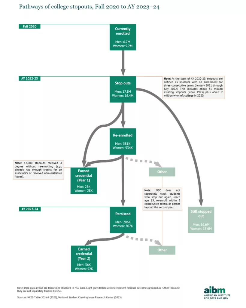 Even when men do start college, they are substantially more likely than women to leave without a credential—and far less likely to return and finish. The result is a large and growing population of men who have assumed many of the costs of college without its corresponding benefits. This points to a second, often overlooked lever: re-engagement—helping the millions of men who have already started college to return, persist, and earn a credential.